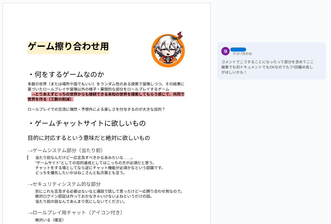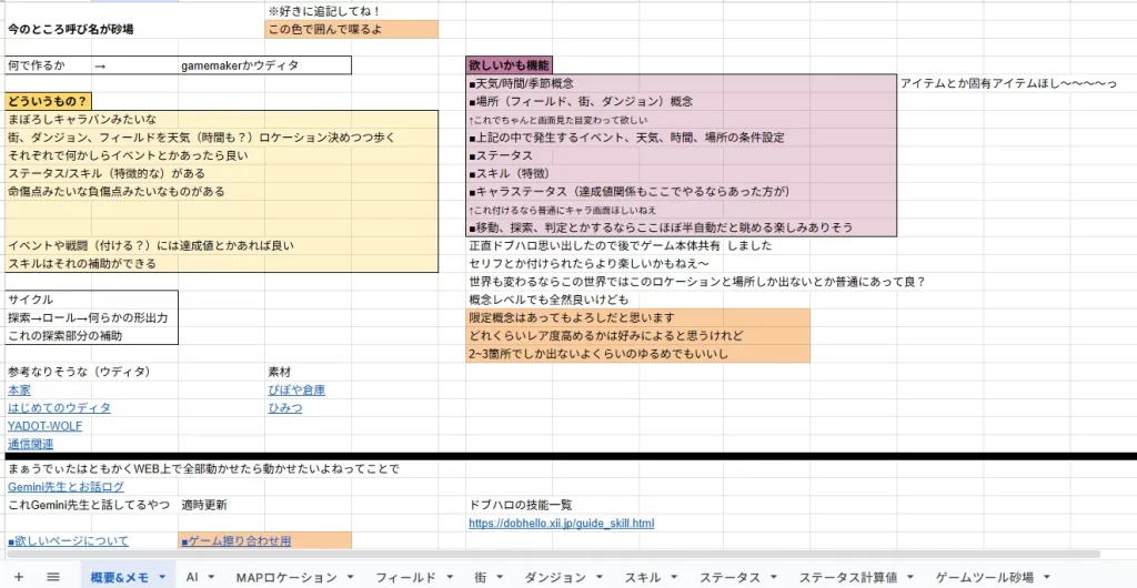 今のところスプレッドシートでデータ関係の整理、上記のドキュメントで必要システムの整理・ついでにお互いの創作設定・舞台設定のまとめを少々。