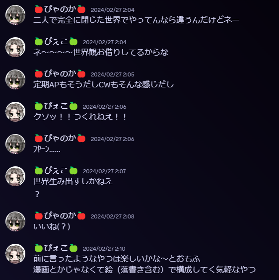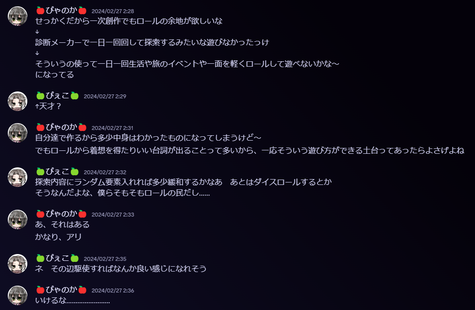 最初はdiscordでの会話②でも話している通り診断メーカーとかでふんわり作ろうかなと思っていたのですが、出来ればチャット機能も欲しいしやるならとことんやりたくなってきた……ということで定期更新ゲームやAP制ゲームに影響を受ける形に。