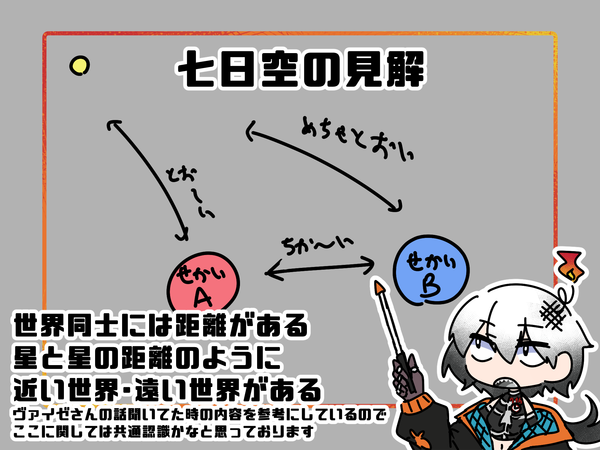 上の図解にはないのですが、通常の次元よりも上の世界で他の世界を観測するタイプの子がいらっしゃるのでその子達にも探索する理由を与えるのと同時に、どんな距離の世界でも問題なく交流が行えるような世界にしたいな~というイメージに。